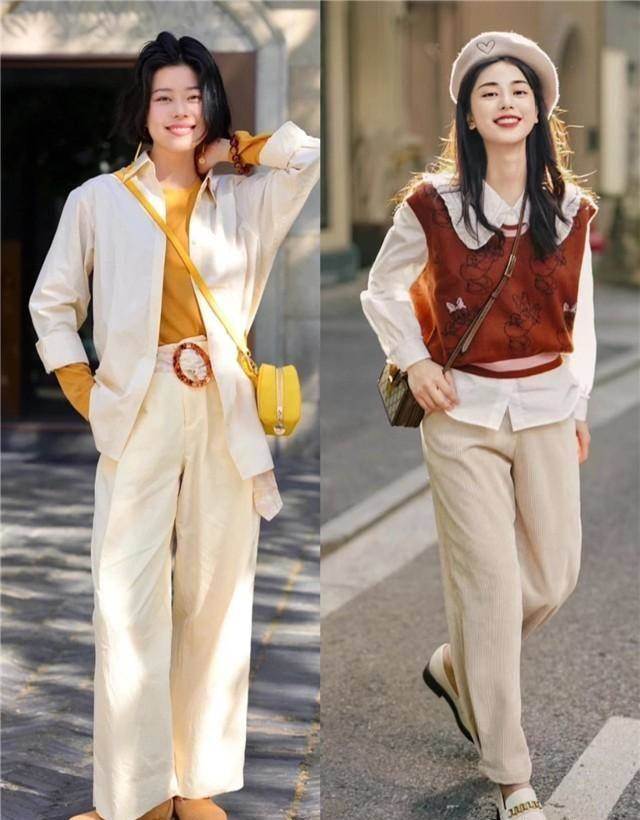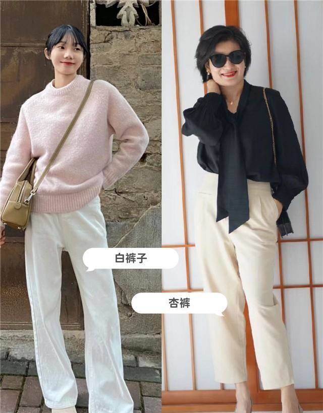 用杏褲和這種普通的白褲子進行對比,你就能夠發現杏褲為什麼這麼受歡迎,首先,普通的白褲子都是這種冷白色調,它的亮度會很高,膨脹感也會稍微更強一些,而且視覺上的沖擊感也更強,一不小心就容易顯胖,或者是導致搭配看上去太艷麗。