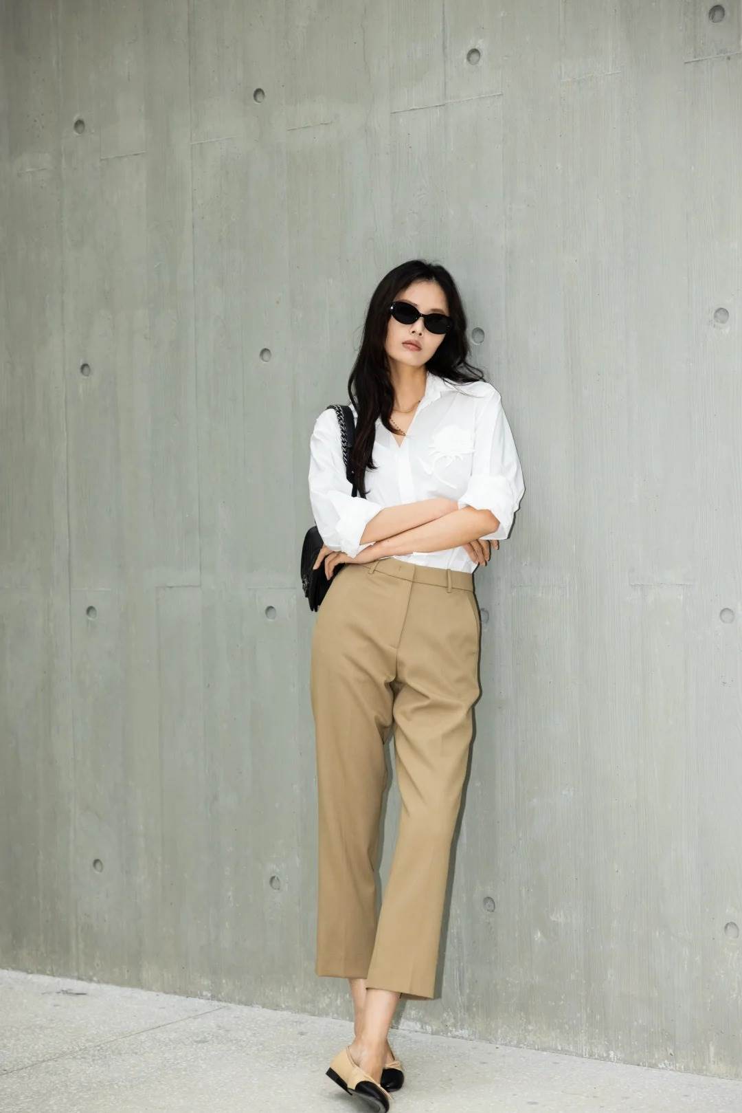 將經典白襯衫下擺自然垂放,搭配微露腳踝的九分卡其褲,是通勤日最得體的打開方式。選擇九分長褲的煙管西裝褲型,利落剪裁與垂墜面料形成縱向延伸感,155cm小個子也能穿出165cm的修長比例。想要打破嚴肅感,不妨將下擺塞進褲腰,打造高腰線,袖口隨意挽起兩折,搭配淺口樂福鞋,露出纖細腳腕,讓職場穿搭既有專業度又不失呼吸感。